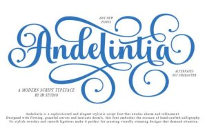 Andelintia is a graceful calligraphy font with long, elegant descenders and swooping tails. It’s a beautiful Cricut choice for formal wedding stationery, luxury brand packaging, and elegant table décor signs.