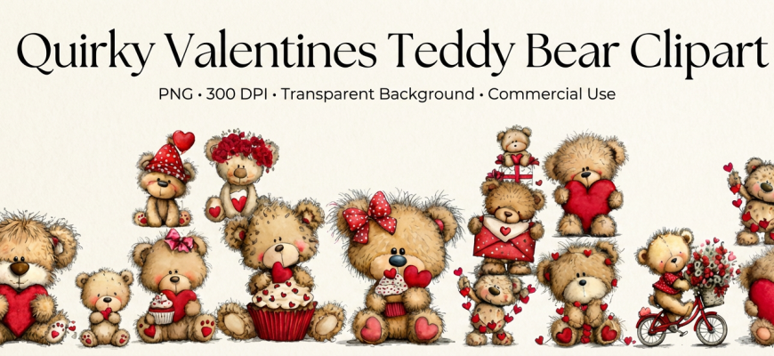 Create warm and heartfelt Valentine’s Day designs with this adorable Quirky Valentines Teddy Bear Clipart set. This collection features cute teddy bears
